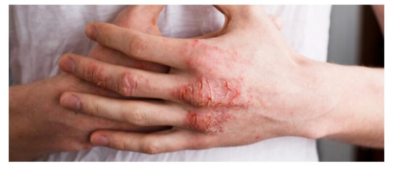 تسبّب الإكزيما بشكل عام تهيج الجلد وحكّة، احمرار وجفافه لدرجة ظهور تشققات وجُلْبَات أي قشرة تتكون فوق